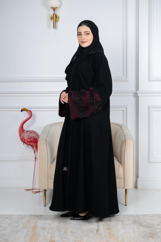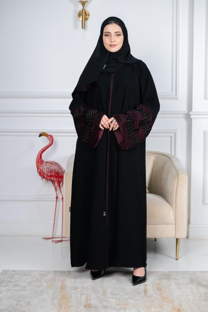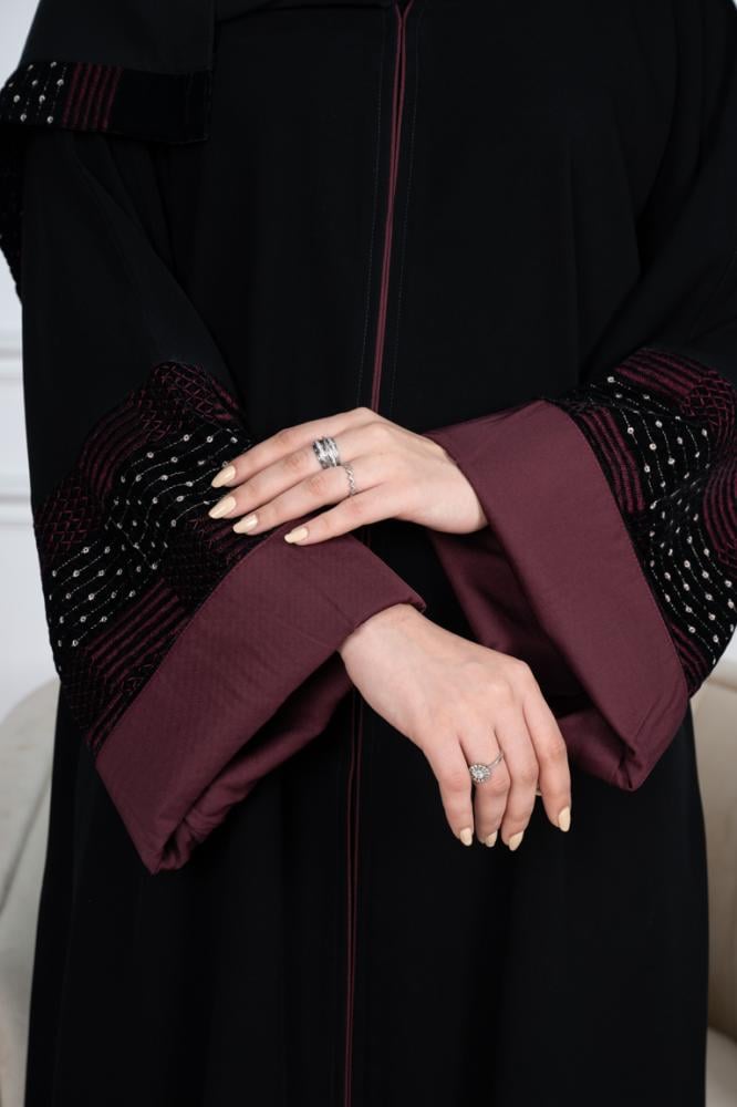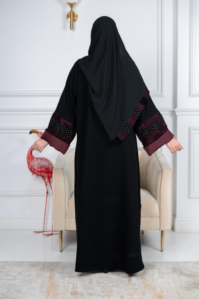 4. مبطن باللون العنابي: الأكمام المبطنه باللون العنابي تعزز الأناقة والدفء في الوقت ذاته، مما يجعل العباية ملائمة لفصول مختلفة من السنة.