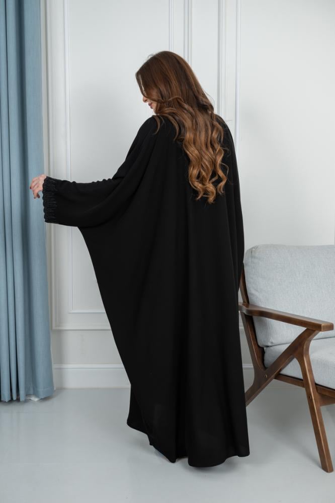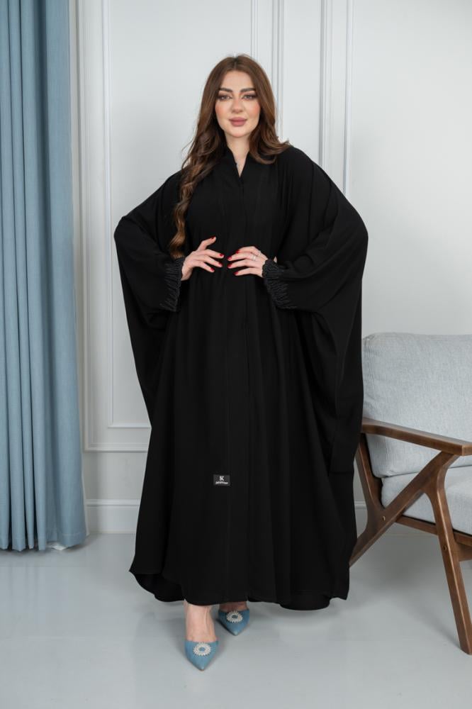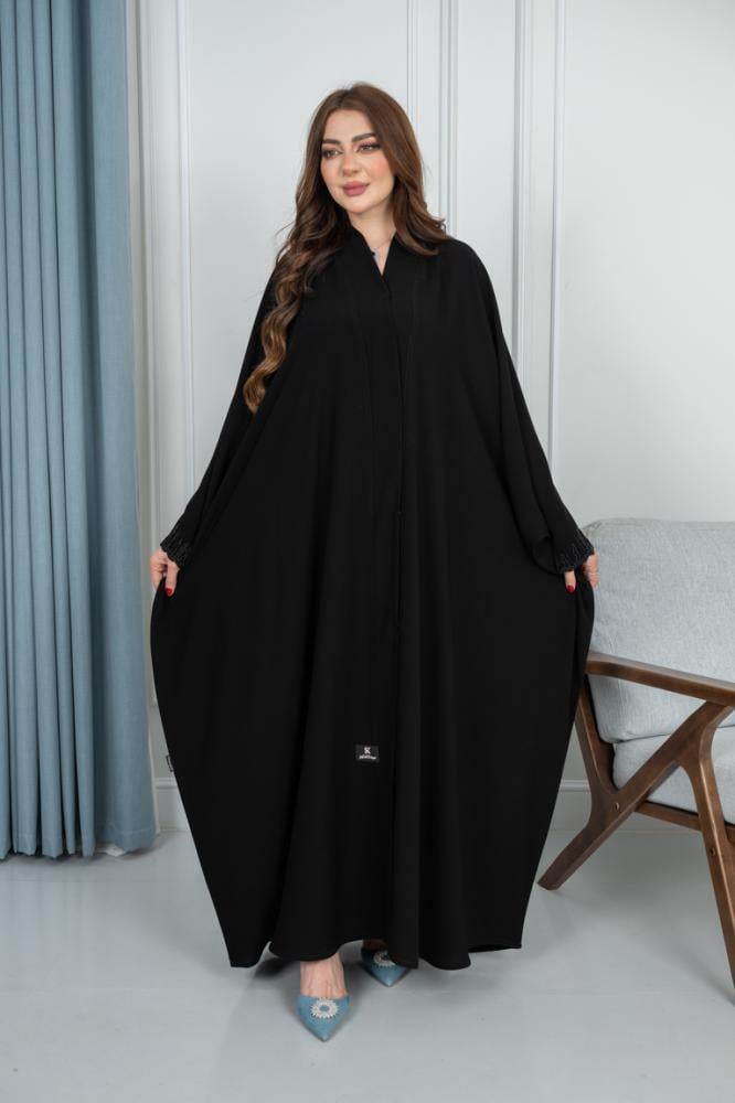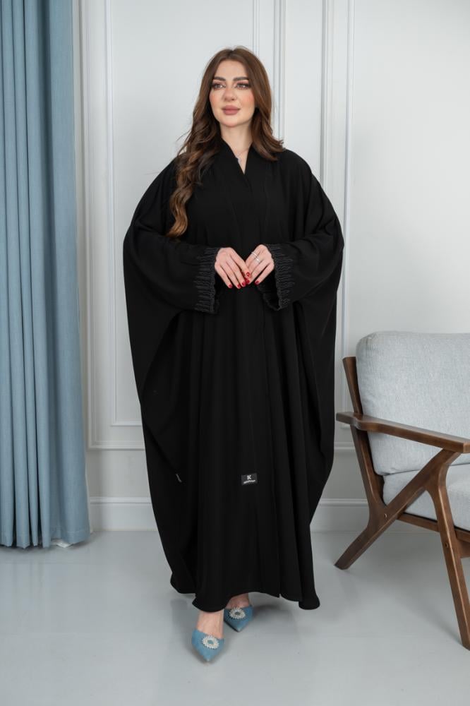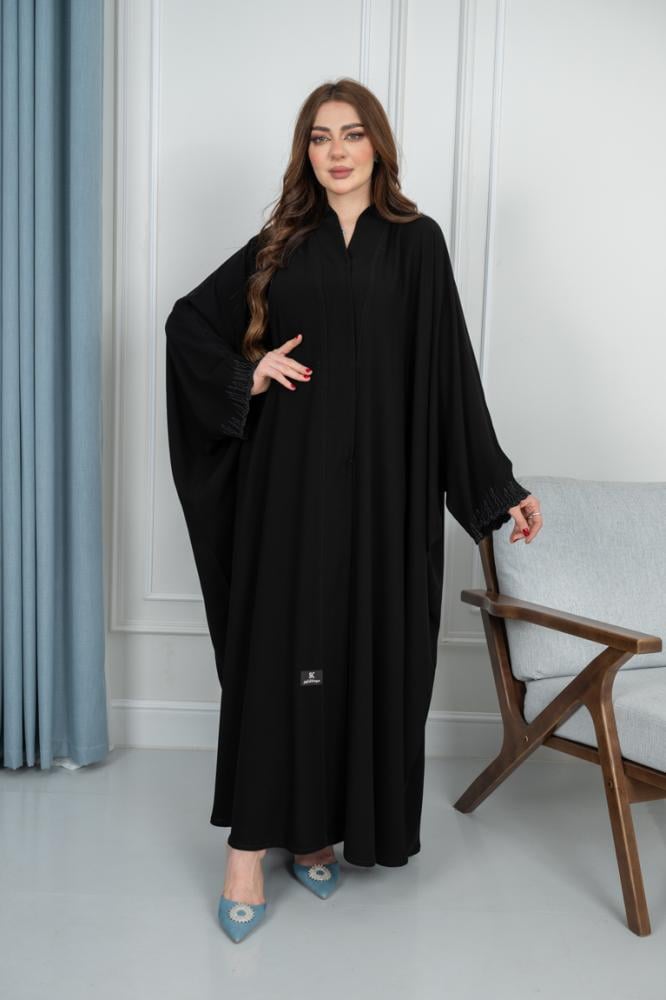 - شك خرز يدوي على أطراف الأكمام: تتميز العباية بـ شك خرز يدوي على أطراف الأكمام، مما يضيف لمسة فنية وفاخرة، ويعكس الحرفية العالية في تصميم العباية. هذه اللمسات الدقيقة تجعل العباية فريدة من نوعها وتضفي عليها مظهرًا مميزًا.
