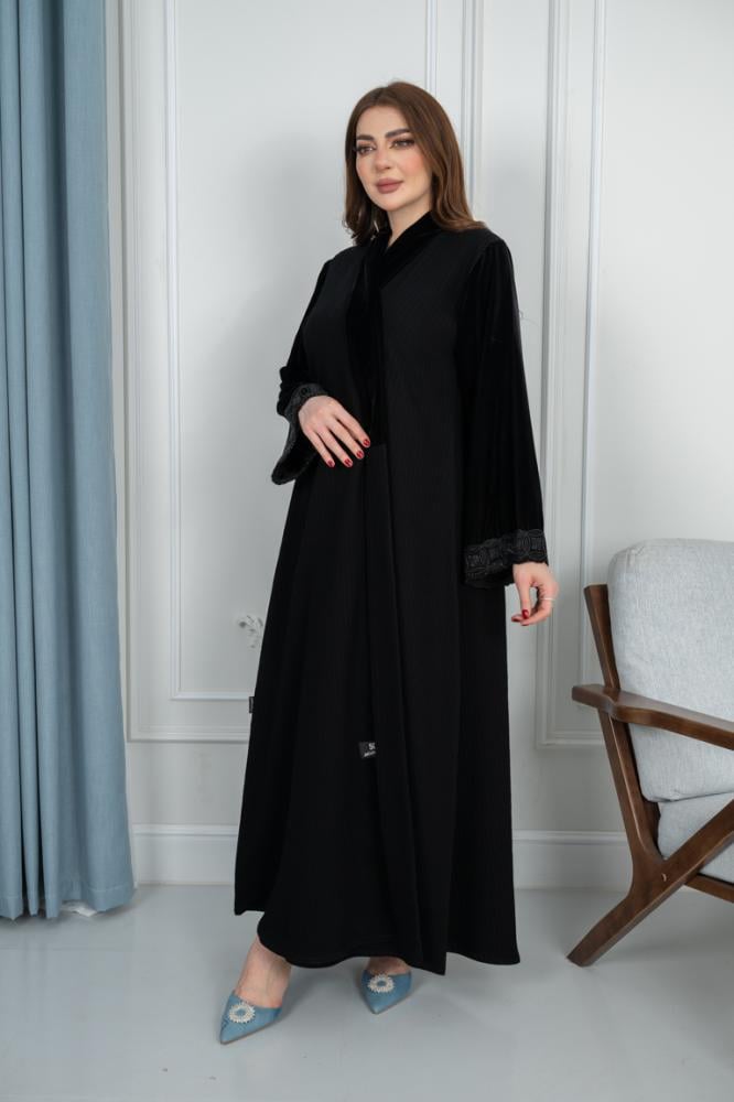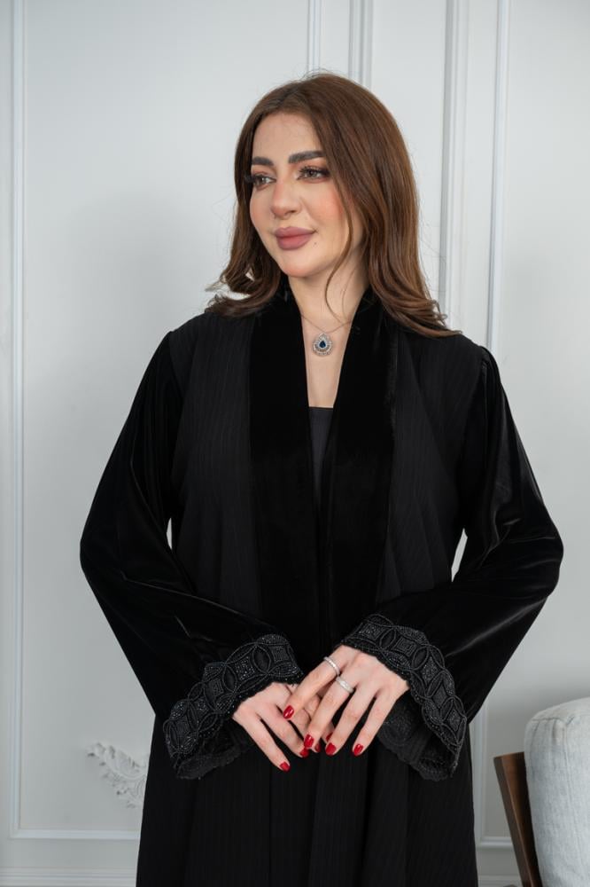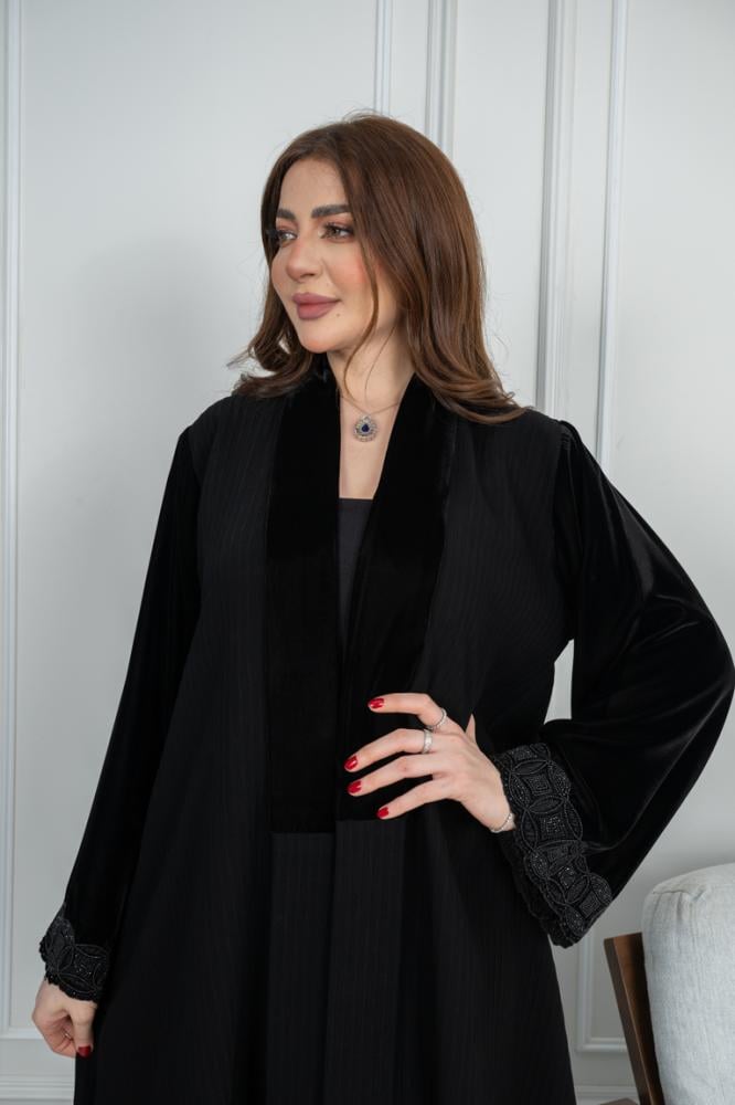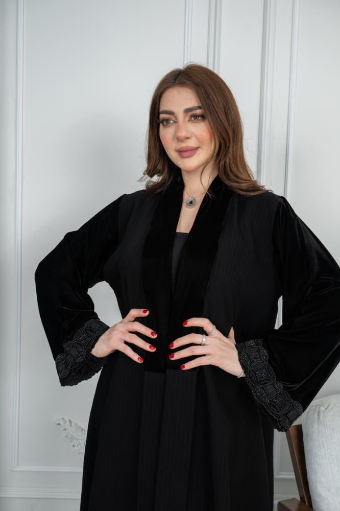 - الوصل المخمل من الإمام: الجزء الأمامي من العباية مزين بـ وصل مخمل فاخر، مما يضيف لمسة من الفخامة والتميز على التصميم. القماش الممخمل يضفي على العباية رونقًا خاصًا يجعلها مثالية للمناسبات الرسمية أو الخاصة.