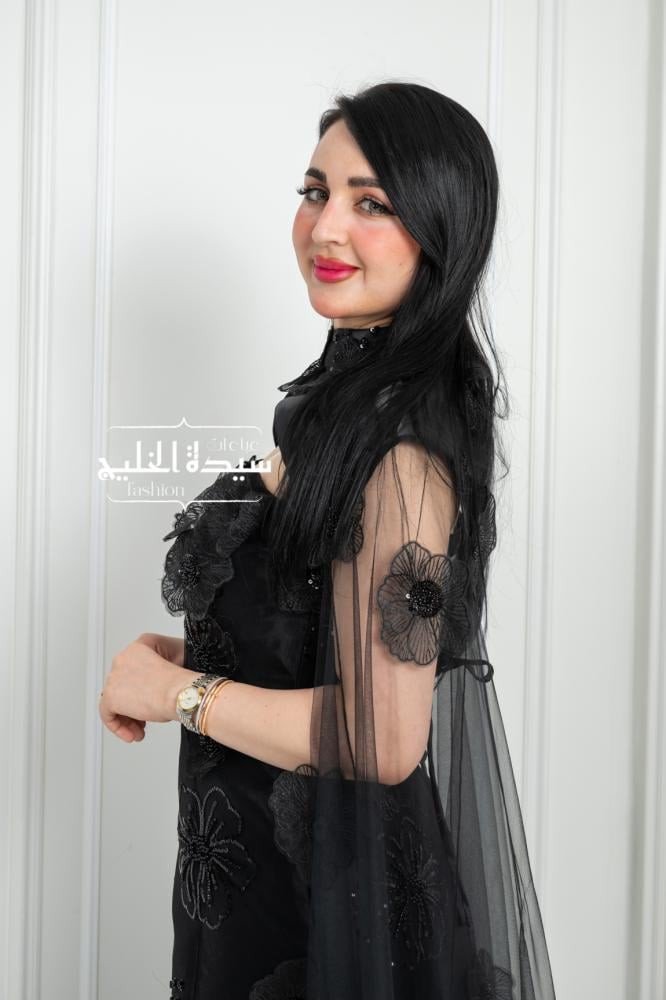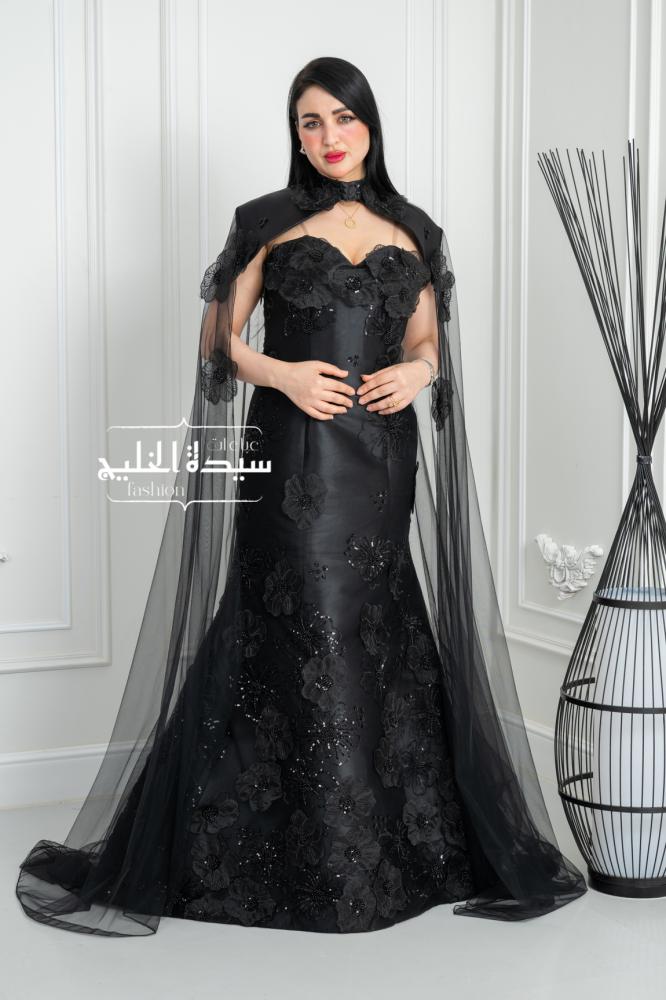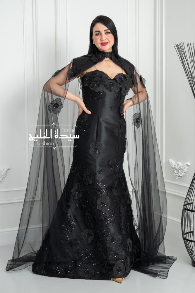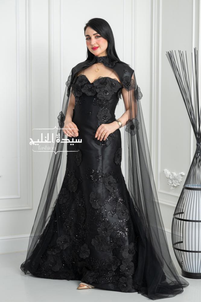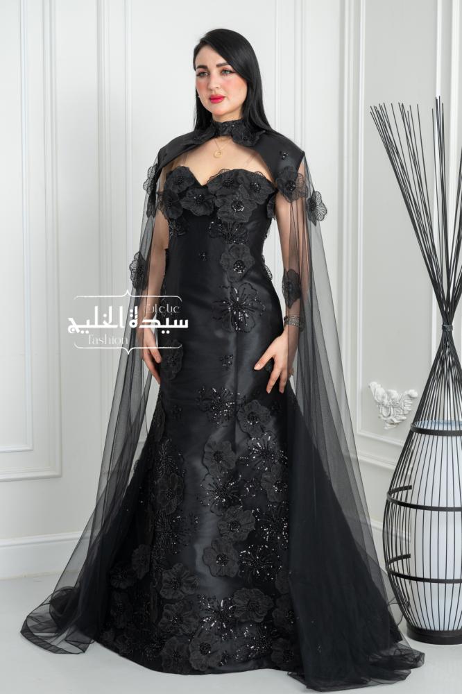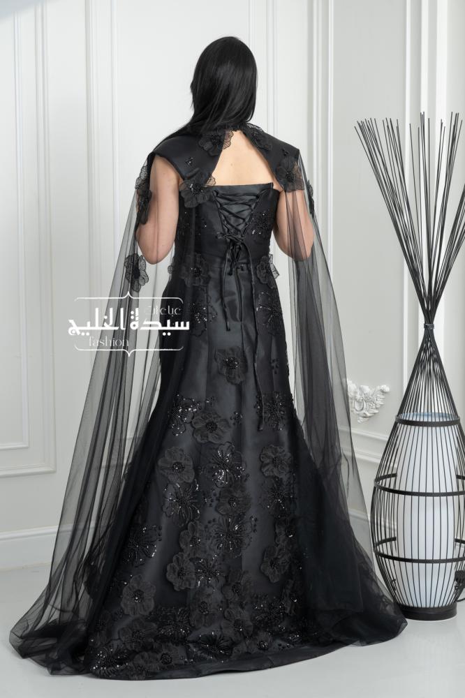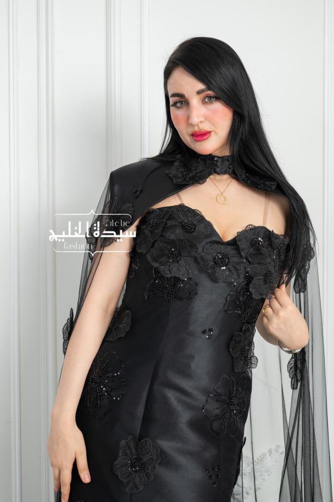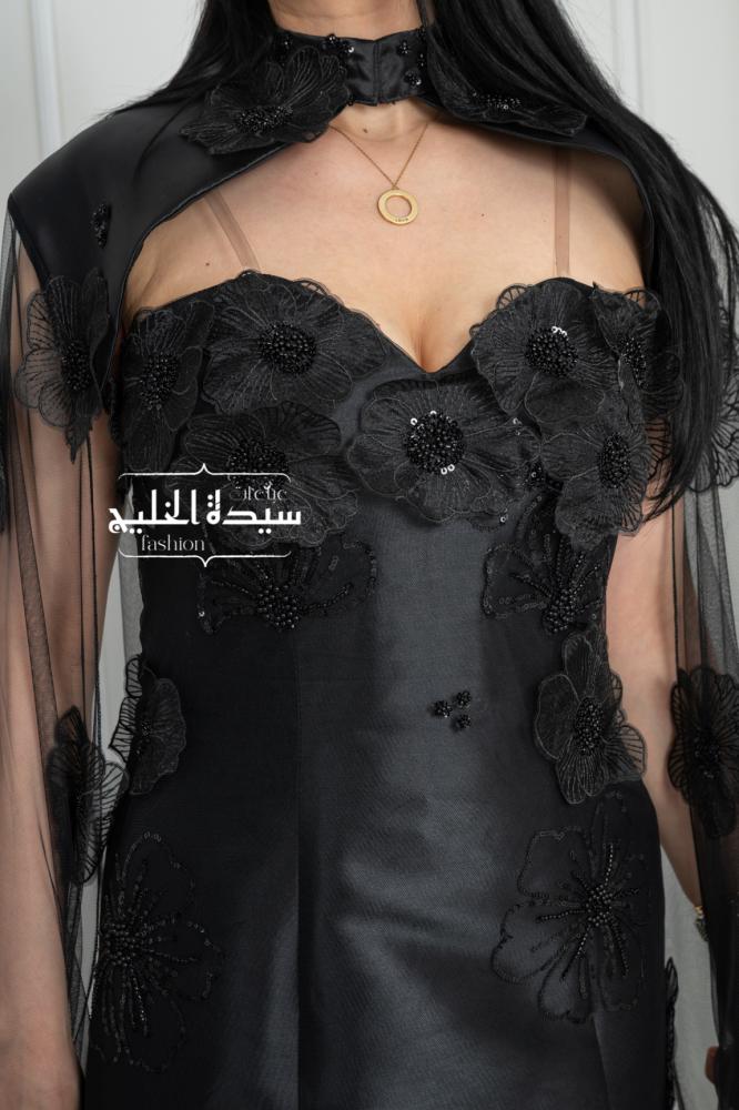 فستان سهرة ورود اسود بشال فخم على الرقبة